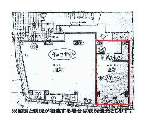 | 設備状況等備考 | ・賃貸保証:加入必須 ・天井防音済み ・解約予告:6ヶ月前 ・NG業種:キャバクラ、ガールズバー等 ・鉄扉不具合あり |